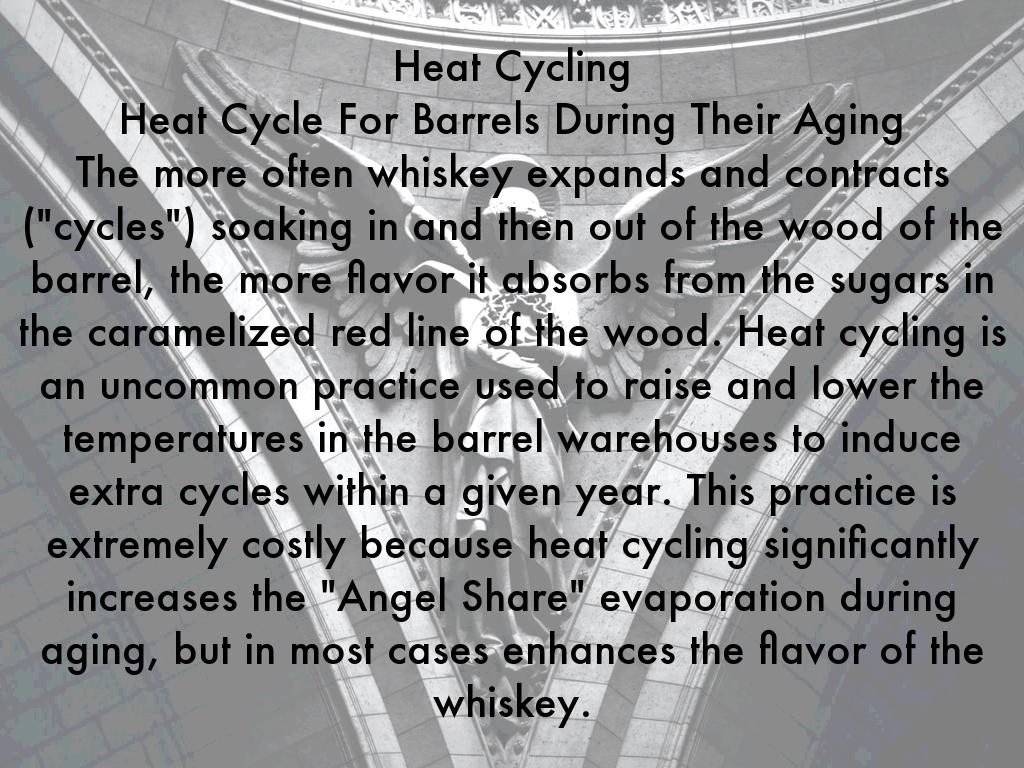 The more often whiskey expands and contracts ("cycles") soaking in and then out of the wood of the barrel, the more flavor it absorbs from the sugars in the caramelized red line of the wood. Heat cycling is an uncommon practice used to raise and lower the temperatures in the barrel warehouses to induce extra cycles within a given year. This practice is extremely costly because heat cycling significantly increases the "Angel Share" evaporation during aging, but in most cases enhances the flavor of the whiskey.