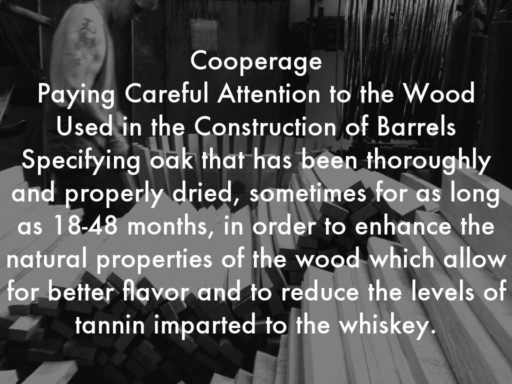 Specifying oak that has been thoroughly and properly dried, sometimes for as long as 18-48 months, in order to enhance the natural properties of the wood which allow for better flavor and to reduce the levels of tannin imparted to the whiskey.