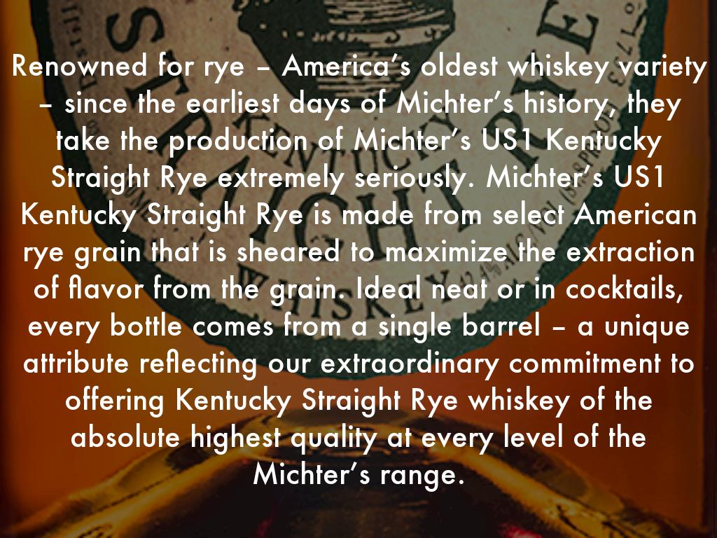 Renowned for rye – America’s oldest whiskey variety – since the earliest days of Michter’s history, they take the production of Michter’s US1 Kentucky Straight Rye extremely seriously. Michter’s US1 Kentucky Straight Rye is made from select American rye grain that is sheared to maximize the extraction of flavor from the grain. Ideal neat or in cocktails, every bottle comes from a single barrel – a unique attribute reflecting our extraordinary commitment to offering Kentucky Straight Rye whiskey of the absolute highest quality at every level of the Michter’s range.