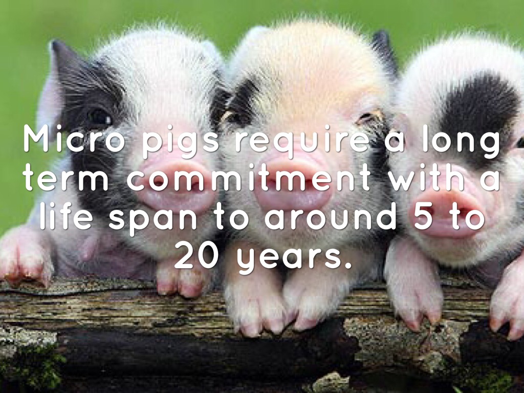 Micro pigs require a long term commitment with a life span to around 5 to 20 years.