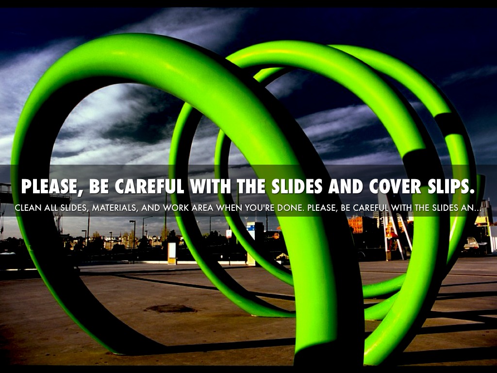 Clean all slides, materials, and work area when you're done. Please, be careful with the slides and cover slips. They are made of glass and if broken, you will get cut and you will bleed.