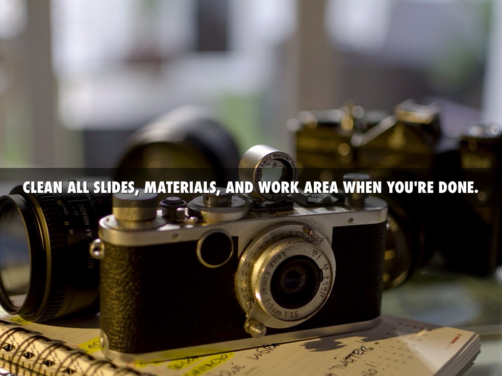 CLEAN ALL SLIDES, MATERIALS, AND WORK AREA WHEN YOU'RE DONE.