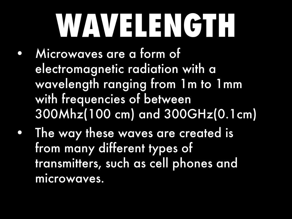 Microwaves are a form of electromagnetic radiation with a wavelength ranging from 1m to 1mm with frequencies of between 300Mhz(100 cm) and 300GHz(0.1cm)