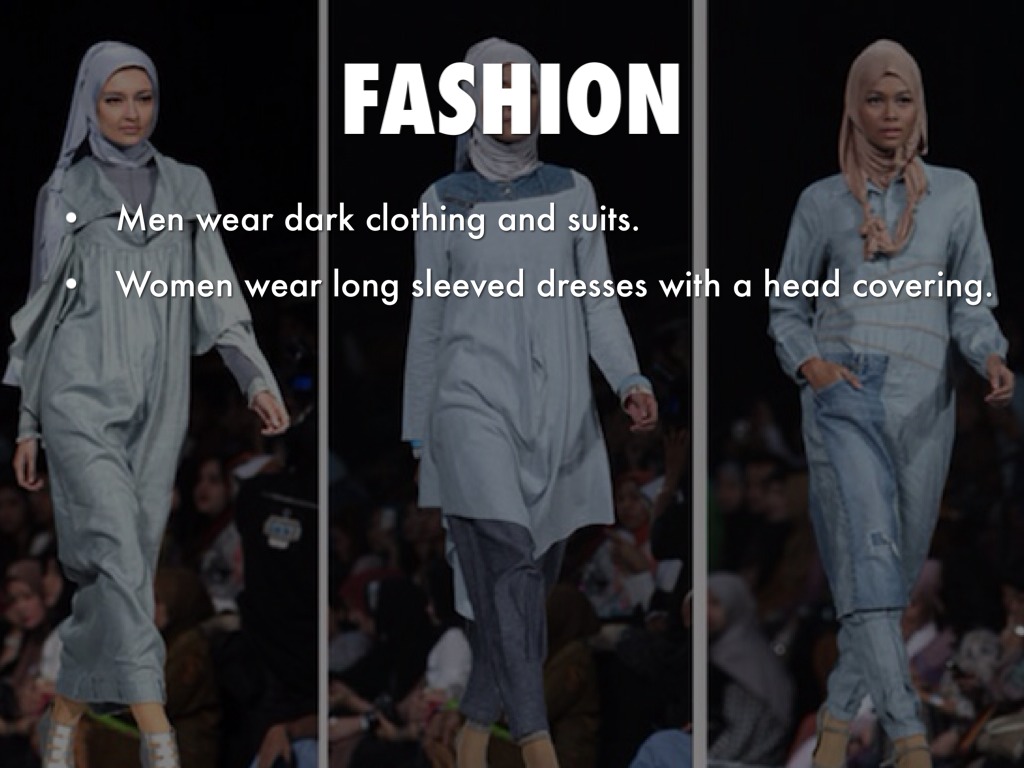 Women wear long sleeved dresses with a head covering.