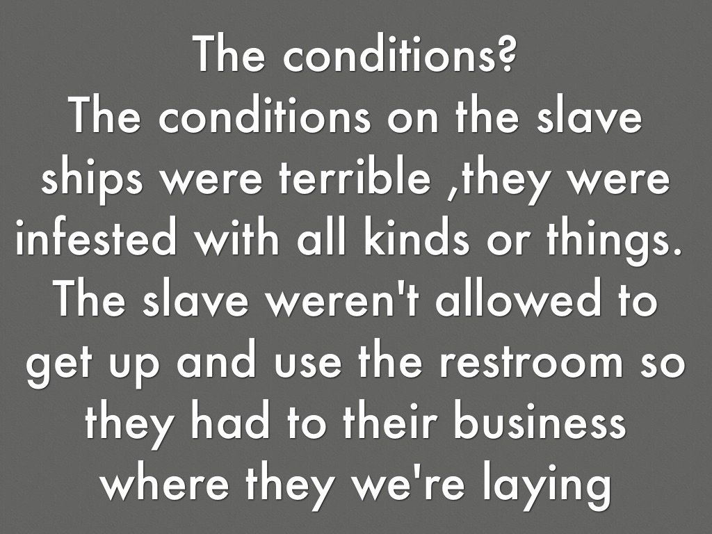 The conditions on the slave ships were terrible ,they were infested with all kinds or things. The slave weren't allowed to get up and use the restroom so they had to their business where they we're laying