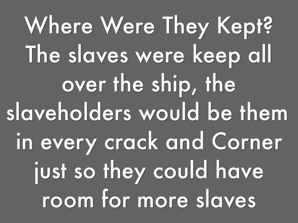 The slaves were keep all over the ship, the slaveholders would be them in every crack and Corner just so they could have room for more slaves