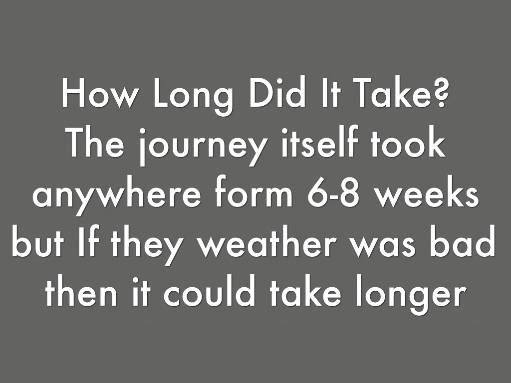 The journey itself took anywhere form 6-8 weeks but If they weather was bad then it could take longer