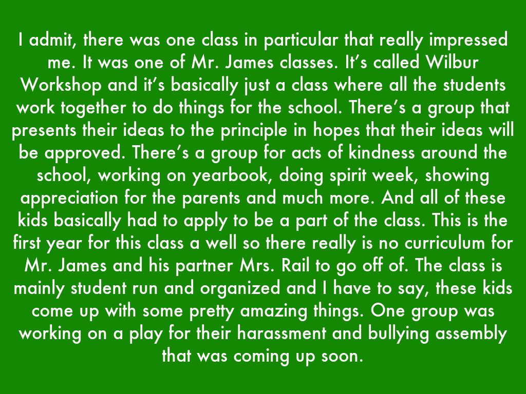 I admit, there was one class in particular that really impressed me. It was one of Mr. James classes. It’s called Wilbur Workshop and it’s basically just a class where all the students work together to do things for the school. There’s a group that presents their ideas to the principle in hopes that their ideas will be approved. There’s a group for acts of kindness around the school, working on yearbook, doing spirit week, showing appreciation for the parents and much more. And all of these kids basically had to apply to be a part of the class. This is the first year for this class a well so there really is no curriculum for Mr. James and his partner Mrs. Rail to go off of. The class is mainly student run and organized and I have to say, these kids come up with some pretty amazing things. One group was working on a play for their harassment and bullying assembly that was coming up soon.