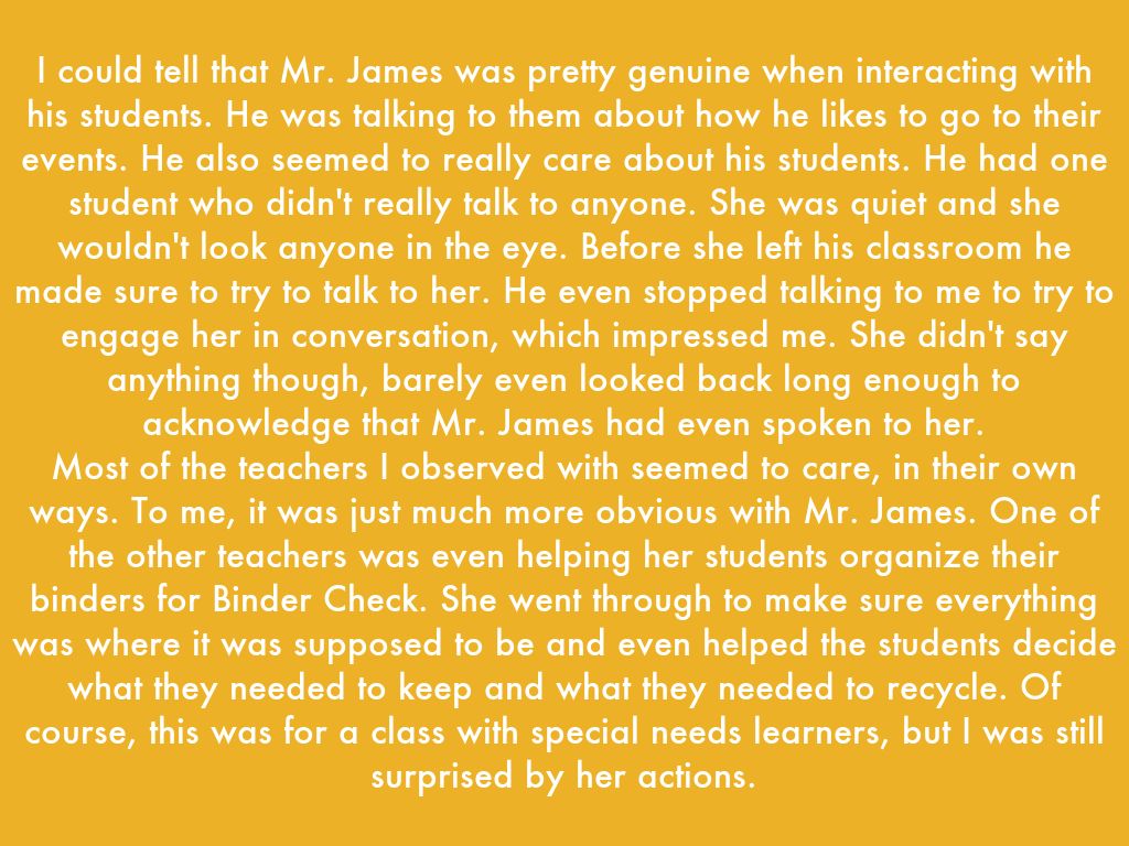 I could tell that Mr. James was pretty genuine when interacting with his students. He was talking to them about how he likes to go to their events. He also seemed to really care about his students. He had one student who didn't really talk to anyone. She was quiet and she wouldn't look anyone in the eye. Before she left his classroom he made sure to try to talk to her. He even stopped talking to me to try to engage her in conversation, which impressed me. She didn't say anything though, barely even looked back long enough to acknowledge that Mr. James had even spoken to her.
