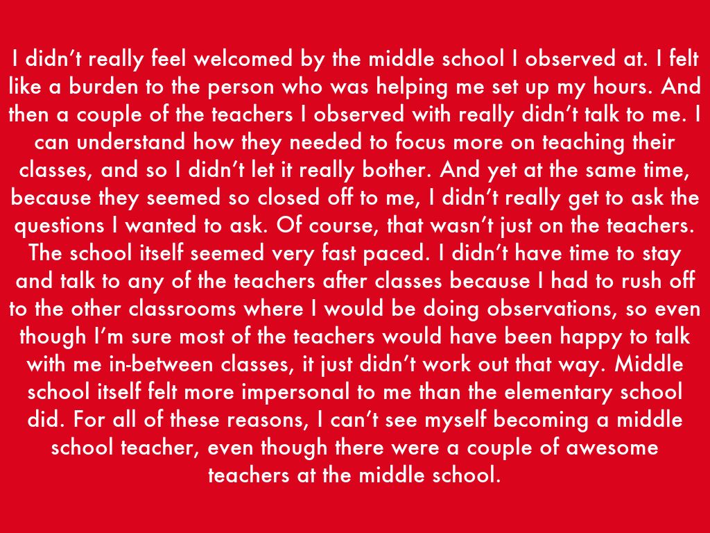 I didn’t really feel welcomed by the middle school I observed at. I felt like a burden to the person who was helping me set up my hours. And then a couple of the teachers I observed with really didn’t talk to me. I can understand how they needed to focus more on teaching their classes, and so I didn’t let it really bother. And yet at the same time, because they seemed so closed off to me, I didn’t really get to ask the questions I wanted to ask. Of course, that wasn’t just on the teachers. The school itself seemed very fast paced. I didn’t have time to stay and talk to any of the teachers after classes because I had to rush off to the other classrooms where I would be doing observations, so even though I’m sure most of the teachers would have been happy to talk with me in-between classes, it just didn’t work out that way. Middle school itself felt more impersonal to me than the elementary school did. For all of these reasons, I can’t see myself becoming a middle school teacher, even though there were a couple of awesome teachers at the middle school.