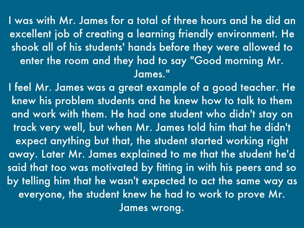 I was with Mr. James for a total of three hours and he did an excellent job of creating a learning friendly environment. He shook all of his students' hands before they were allowed to enter the room and they had to say "Good morning Mr. James."