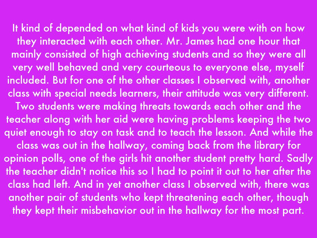 It kind of depended on what kind of kids you were with on how they interacted with each other. Mr. James had one hour that mainly consisted of high achieving students and so they were all very well behaved and very courteous to everyone else, myself included. But for one of the other classes I observed with, another class with special needs learners, their attitude was very different. Two students were making threats towards each other and the teacher along with her aid were having problems keeping the two quiet enough to stay on task and to teach the lesson. And while the class was out in the hallway, coming back from the library for opinion polls, one of the girls hit another student pretty hard. Sadly the teacher didn't notice this so I had to point it out to her after the class had left. And in yet another class I observed with, there was another pair of students who kept threatening each other, though they kept their misbehavior out in the hallway for the most part.