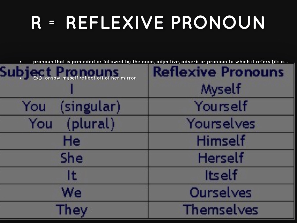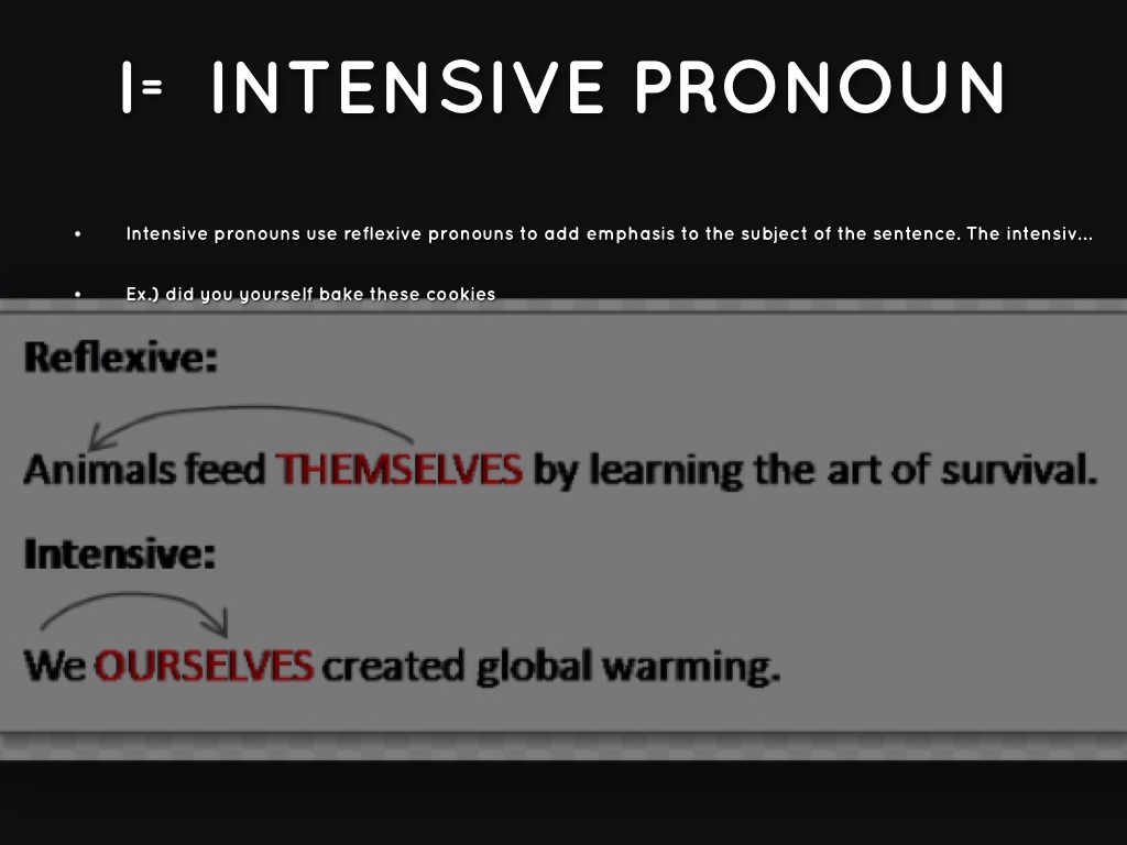 Intensive pronouns use reflexive pronouns to add emphasis to the subject of the sentence. The intensive/reflexive pronouns are myself, yourself, himself, herself, itself, ourselves, yourselves and themselves. You’ll usually find the intensive pronoun right after the noun or pronoun it’s modifying, but not necessarily.