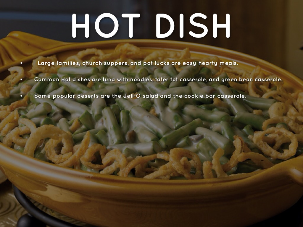 Common Hot dishes are tuna with noodles, tater tot casserole, and green bean casserole.