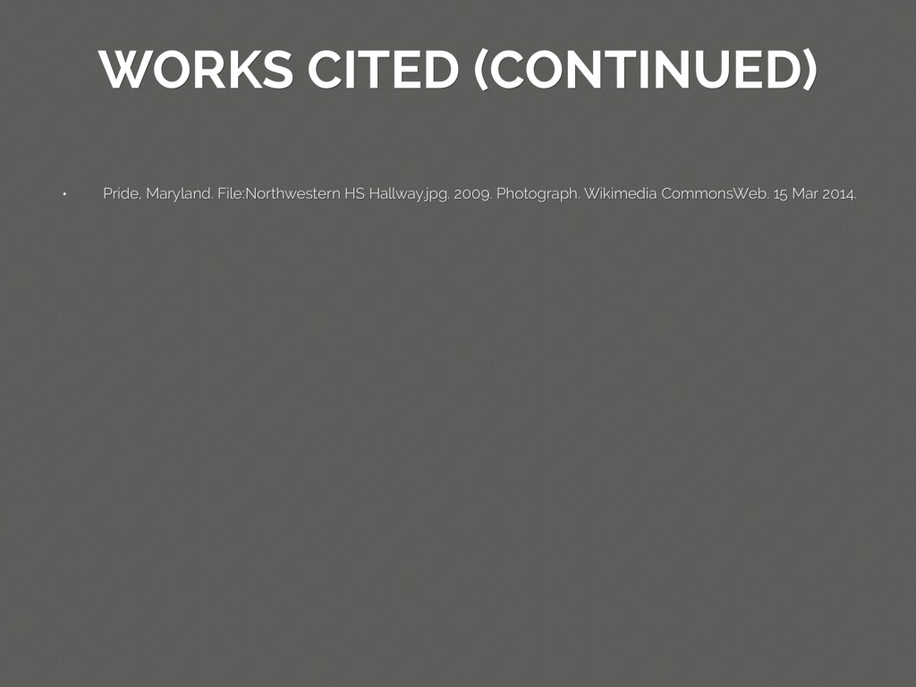 - Pride, Maryland. File:Northwestern HS Hallway.jpg. 2009. Photograph. Wikimedia CommonsWeb. 15 Mar 2014.