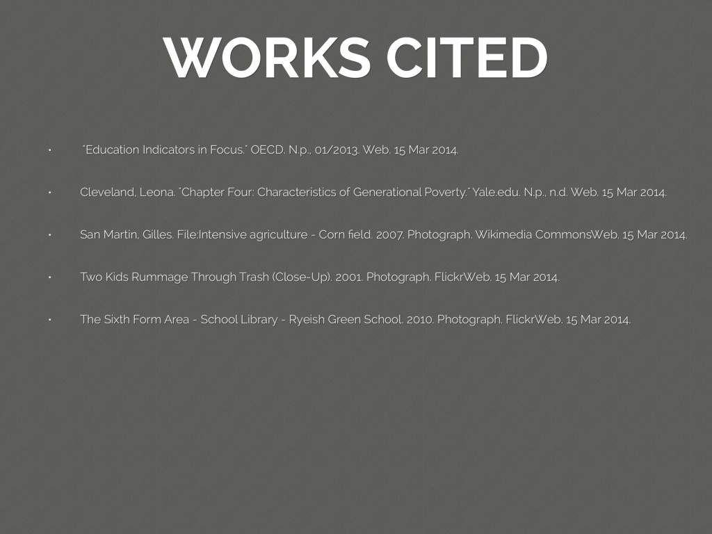 - Cleveland, Leona. "Chapter Four: Characteristics of Generational Poverty." Yale.edu. N.p., n.d. Web. 15 Mar 2014.