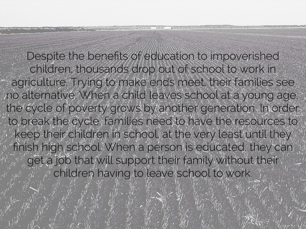 Despite the benefits of education to impoverished children, thousands drop out of school to work in agriculture. Trying to make ends meet, their families see no alternative. When a child leaves school at a young age, the cycle of poverty grows by another generation. In order to break the cycle, families need to have the resources to keep their children in school, at the very least until they finish high school. When a person is educated, they can get a job that will support their family without their children having to leave school to work.