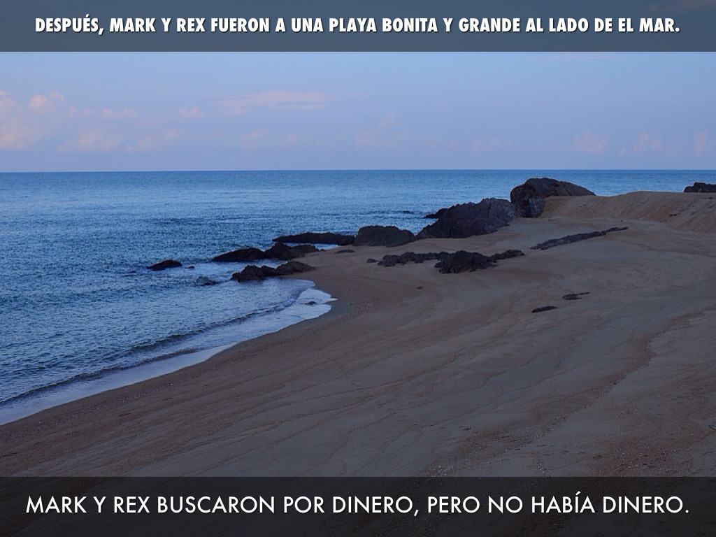DESPUÉS, MARK Y REX FUERON A UNA PLAYA BONITA Y GRANDE AL LADO DE EL MAR.