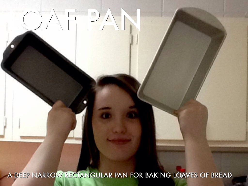 A DEEP NARROW RECTANGULAR PAN FOR BAKING LOAVES OF BREAD.
