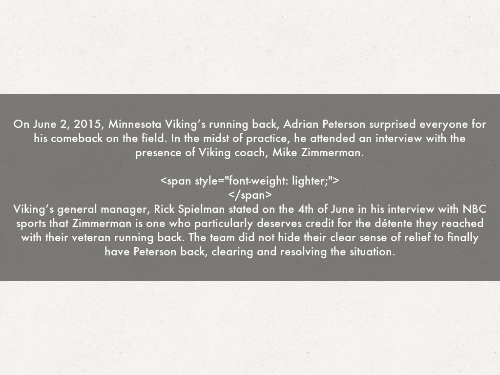 On June 2, 2015, Minnesota Viking’s running back, Adrian Peterson surprised everyone for his comeback on the field. In the midst of practice, he attended an interview with the presence of Viking coach, Mike Zimmerman.