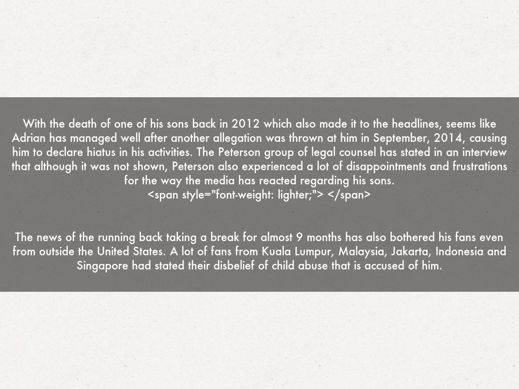 The news of the running back taking a break for almost 9 months has also bothered his fans even from outside the United States. A lot of fans from Kuala Lumpur, Malaysia, Jakarta, Indonesia and Singapore had stated their disbelief of child abuse that is accused of him.