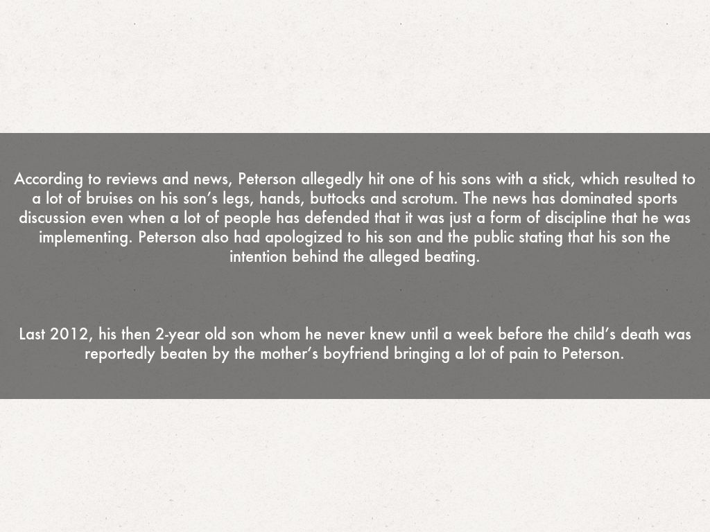 According to reviews and news, Peterson allegedly hit one of his sons with a stick, which resulted to a lot of bruises on his son’s legs, hands, buttocks and scrotum. The news has dominated sports discussion even when a lot of people has defended that it was just a form of discipline that he was implementing. Peterson also had apologized to his son and the public stating that his son the intention behind the alleged beating.