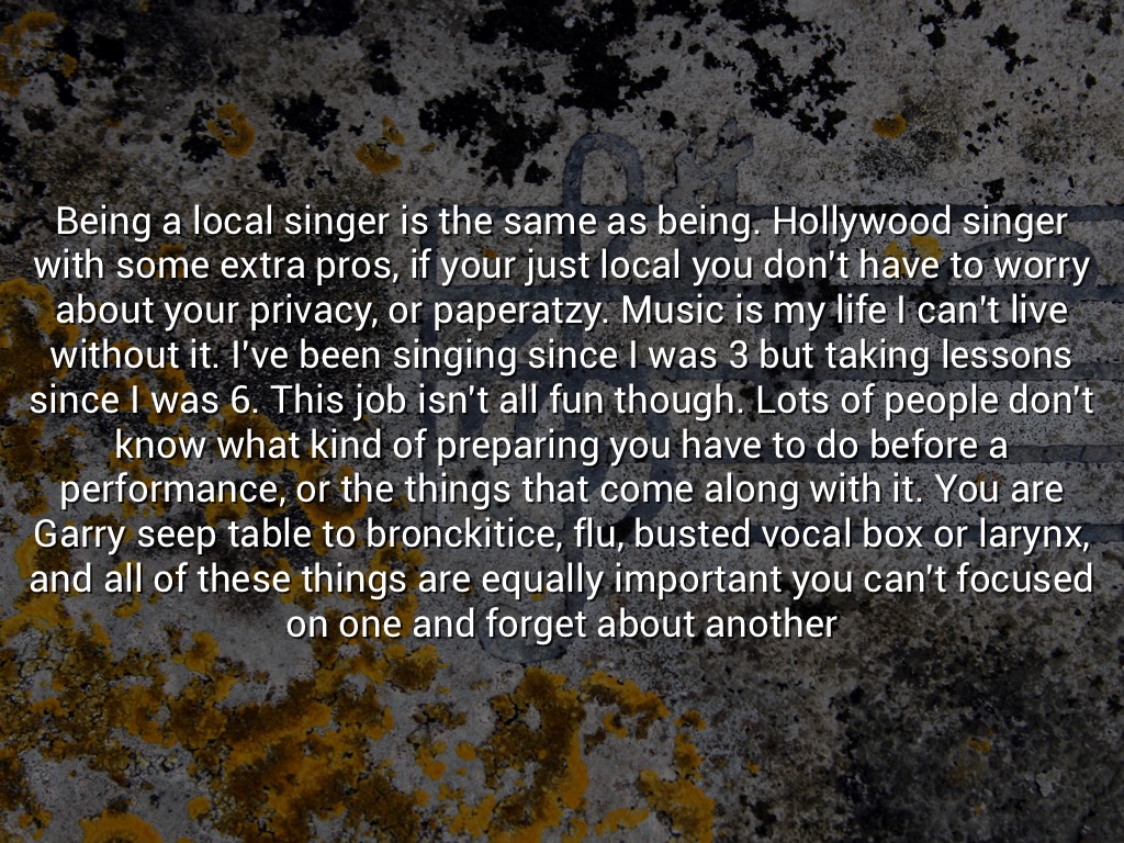 Being a local singer is the same as being. Hollywood singer with some extra pros, if your just local you don't have to worry about your privacy, or paperatzy. Music is my life I can't live without it. I've been singing since I was 3 but taking lessons since I was 6. This job isn't all fun though. Lots of people don't know what kind of preparing you have to do before a performance, or the things that come along with it. You are Garry seep table to bronckitice, flu, busted vocal box or larynx, and all of these things are equally important you can't focused on one and forget about another