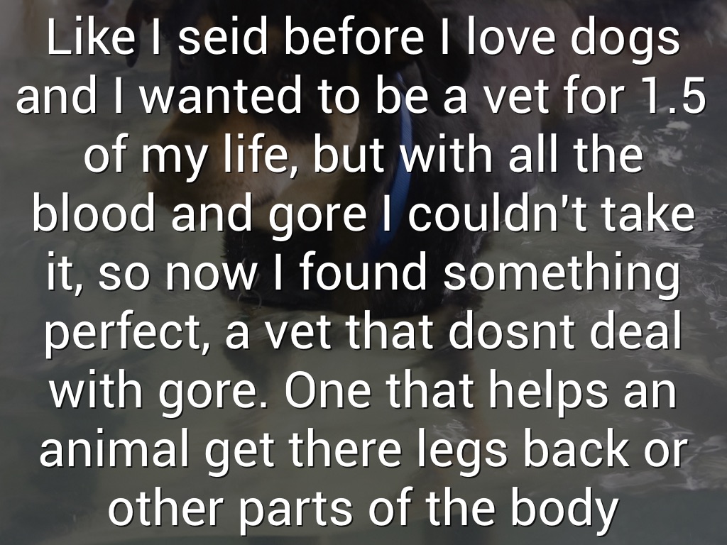 Like I seid before I love dogs and I wanted to be a vet for 1.5 of my life, but with all the blood and gore I couldn't take it, so now I found something perfect, a vet that dosnt deal with gore. One that helps an animal get there legs back or other parts of the body