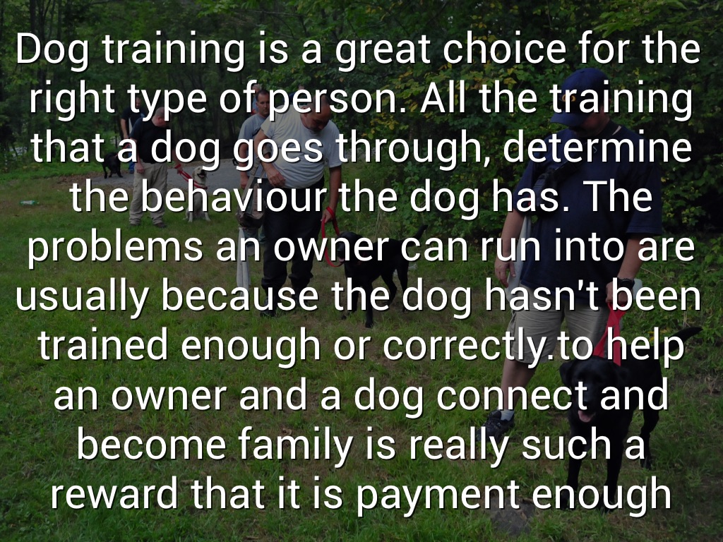 Dog training is a great choice for the right type of person. All the training that a dog goes through, determine the behaviour the dog has. The problems an owner can run into are usually because the dog hasn't been trained enough or correctly.to help an owner and a dog connect and become family is really such a reward that it is payment enough