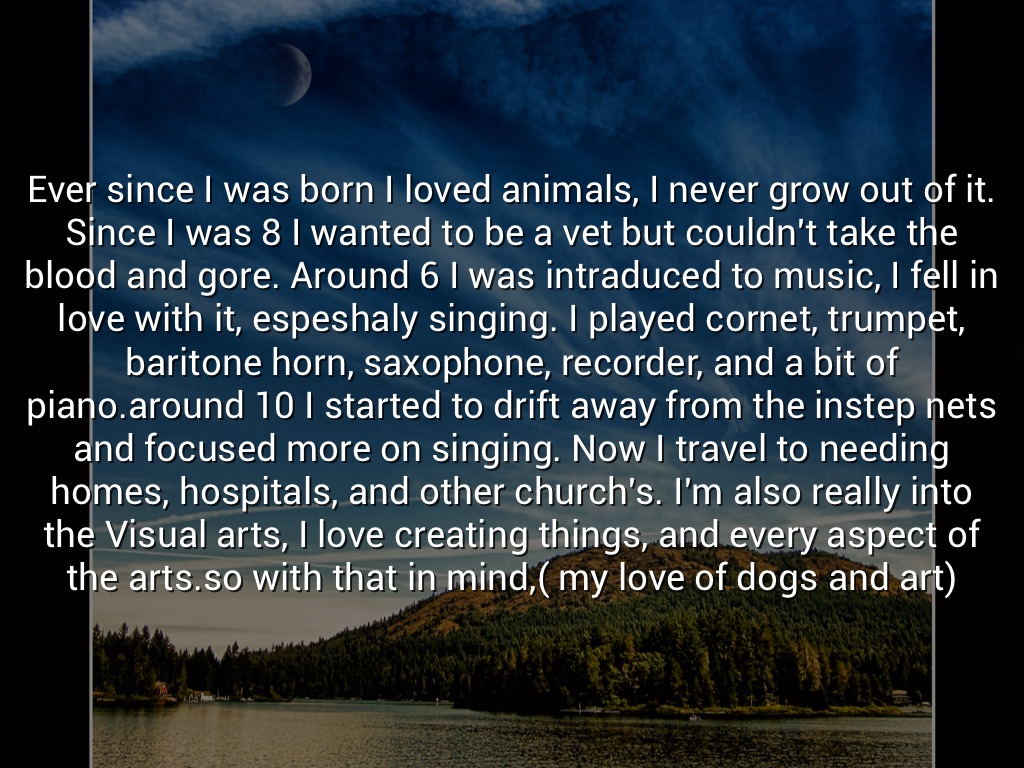 Ever since I was born I loved animals, I never grow out of it. Since I was 8 I wanted to be a vet but couldn't take the blood and gore. Around 6 I was intraduced to music, I fell in love with it, espeshaly singing. I played cornet, trumpet, baritone horn, saxophone, recorder, and a bit of piano.around 10 I started to drift away from the instep nets and focused more on singing. Now I travel to needing homes, hospitals, and other church's. I'm also really into the Visual arts, I love creating things, and every aspect of the arts.so with that in mind,( my love of dogs and art)