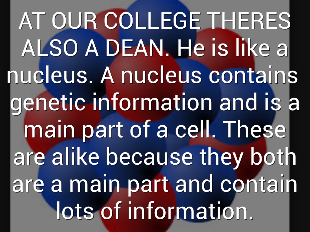 AT OUR COLLEGE THERES ALSO A DEAN. He is like a nucleus. A nucleus contains genetic information and is a main part of a cell. These are alike because they both are a main part and contain lots of information.