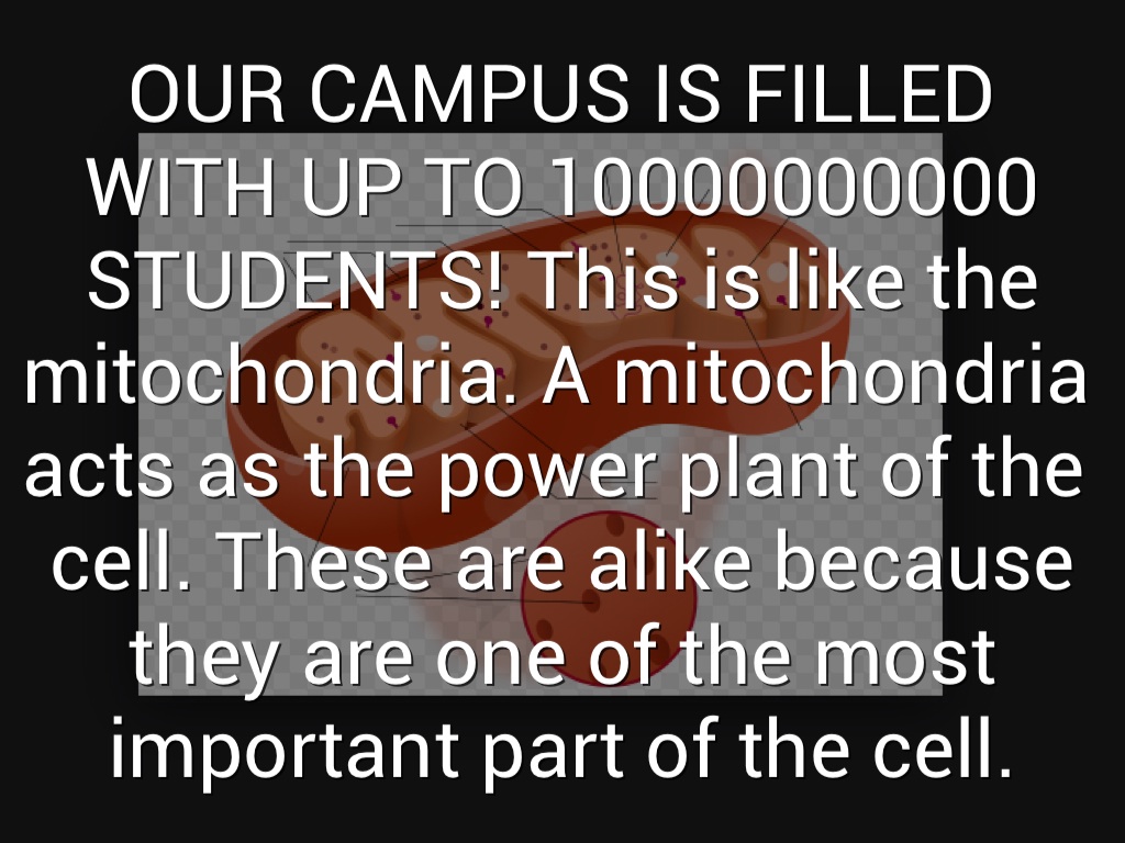 OUR CAMPUS IS FILLED WITH UP TO 10000000000 STUDENTS! This is like the mitochondria. A mitochondria acts as the power plant of the cell. These are alike because they are one of the most important part of the cell.