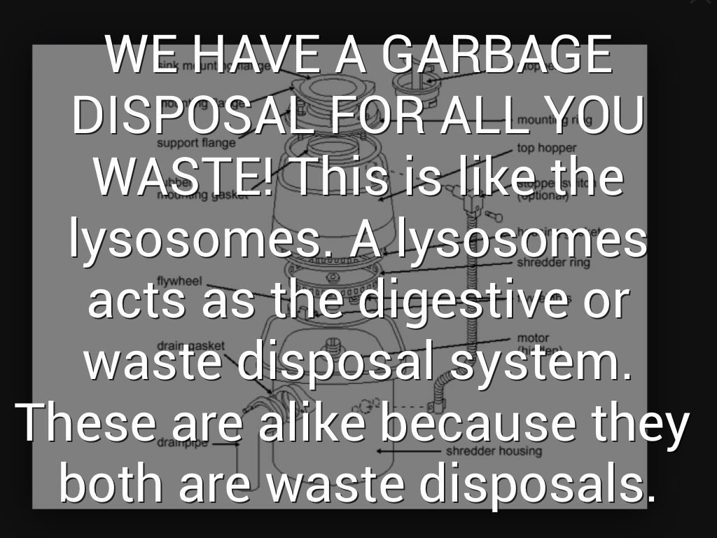 WE HAVE A GARBAGE DISPOSAL FOR ALL YOU WASTE! This is like the lysosomes. A lysosomes acts as the digestive or waste disposal system. These are alike because they both are waste disposals.