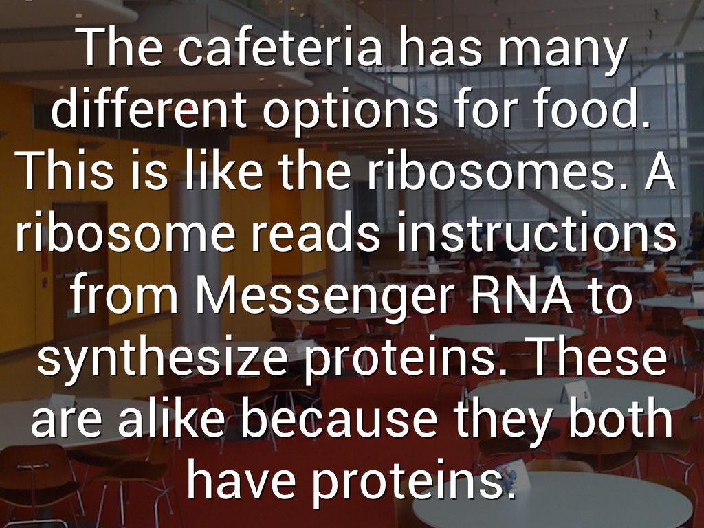 The cafeteria has many different options for food. This is like the ribosomes. A ribosome reads instructions from Messenger RNA to synthesize proteins. These are alike because they both have proteins.