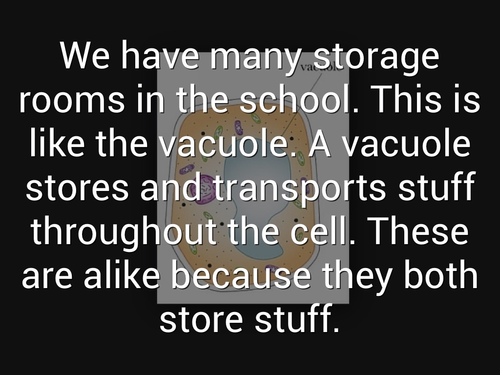 We have many storage rooms in the school. This is like the vacuole. A vacuole stores and transports stuff throughout the cell. These are alike because they both store stuff.