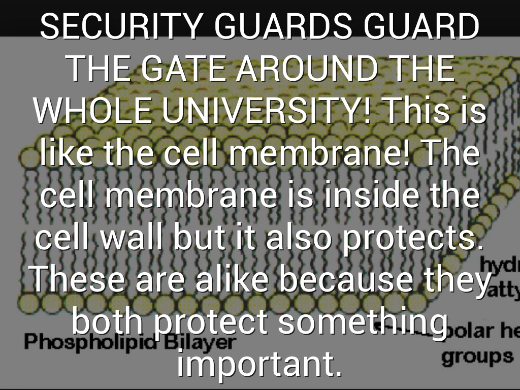SECURITY GUARDS GUARD THE GATE AROUND THE WHOLE UNIVERSITY! This is like the cell membrane! The cell membrane is inside the cell wall but it also protects. These are alike because they both protect something important.