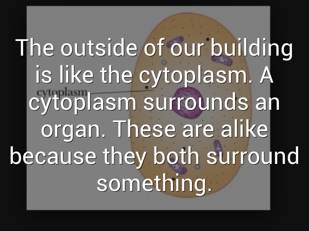 The outside of our building is like the cytoplasm. A cytoplasm surrounds an organ. These are alike because they both surround something.
