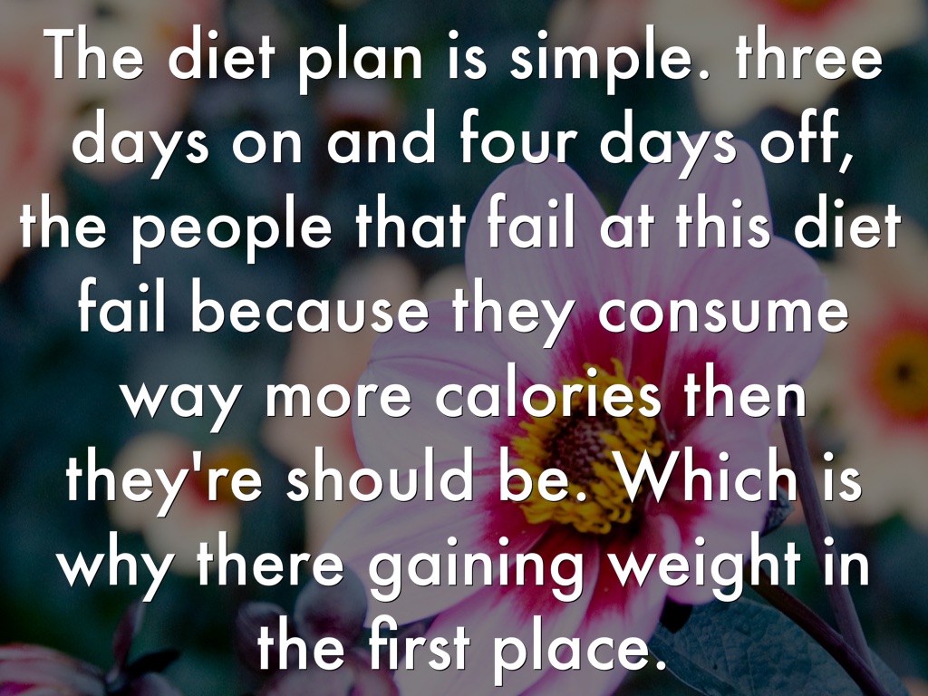 The diet plan is simple. three days on and four days off, the people that fail at this diet fail because they consume way more calories then they're should be. Which is why there gaining weight in the first place.