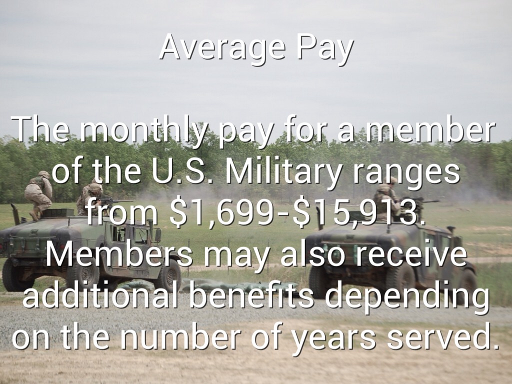 The monthly pay for a member of the U.S. Military ranges from $1,699-$15,913. Members may also receive additional benefits depending on the number of years served.