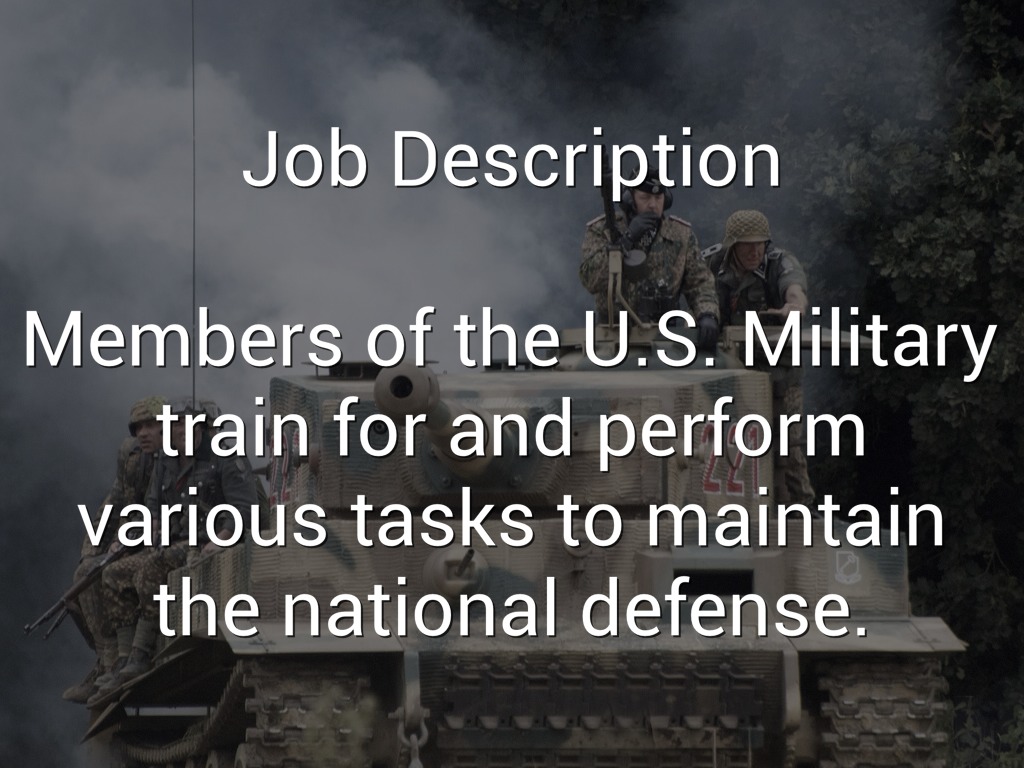 Members of the U.S. Military train for and perform various tasks to maintain the national defense.