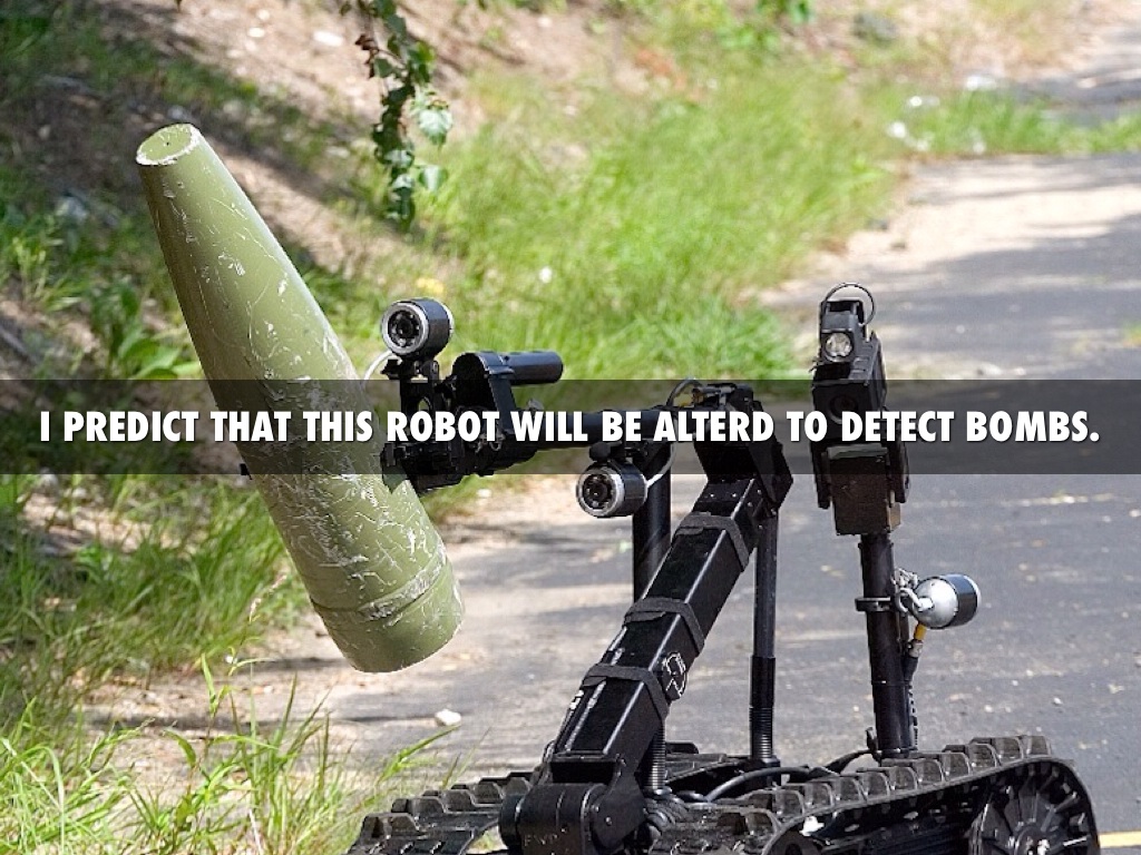 I PREDICT THAT THIS ROBOT WILL BE ALTERD TO DETECT BOMBS.