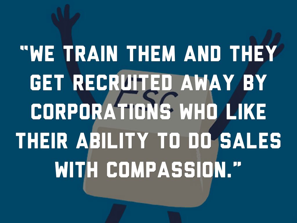 “We train them and they get recruited away by corporations who like their ability to do sales with compassion.”