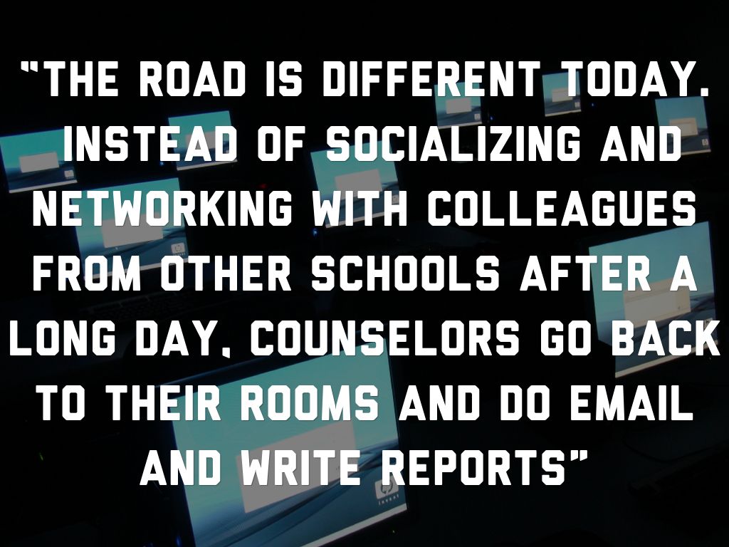 “The road is different today. Instead of socializing and networking with colleagues from other schools after a long day, counselors go back to their rooms and do email and write reports”