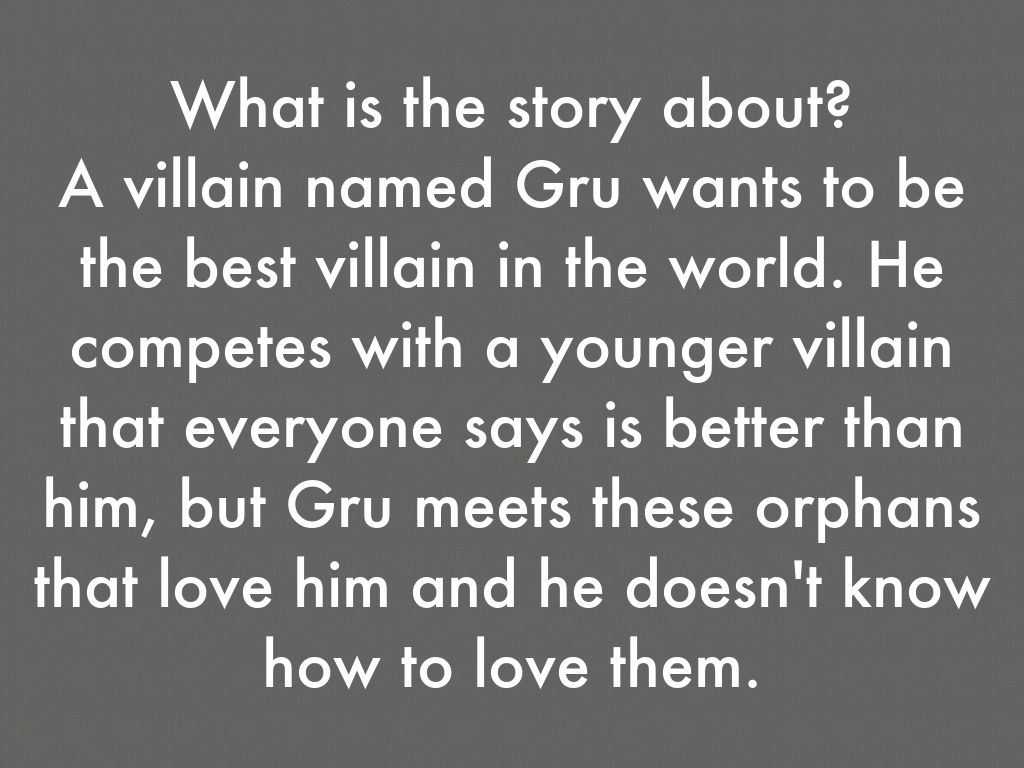 A villain named Gru wants to be the best villain in the world. He competes with a younger villain that everyone says is better than him, but Gru meets these orphans that love him and he doesn't know how to love them.