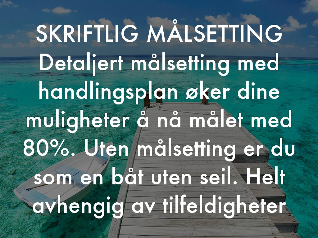 SKRIFTLIG MÅLSETTING Detaljert målsetting med handlingsplan øker dine muligheter å nå målet med 80%. Uten målsetting er du som en båt uten seil. Helt avhengig av tilfeldigheter