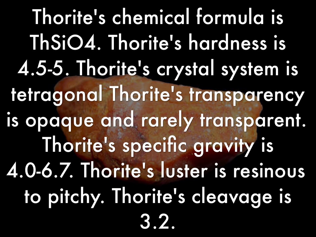 Thorite's chemical formula is ThSiO4. Thorite's hardness is 4.5-5. Thorite's crystal system is tetragonal Thorite's transparency is opaque and rarely transparent. Thorite's specific gravity is 4.0-6.7. Thorite's luster is resinous to pitchy. Thorite's cleavage is 3.2.