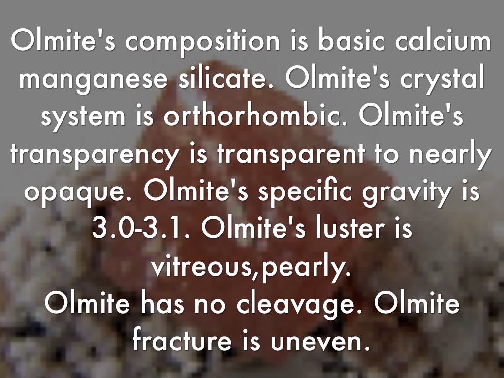 Olmite's composition is basic calcium manganese silicate. Olmite's crystal system is orthorhombic. Olmite's transparency is transparent to nearly opaque. Olmite's specific gravity is 3.0-3.1. Olmite's luster is vitreous,pearly.