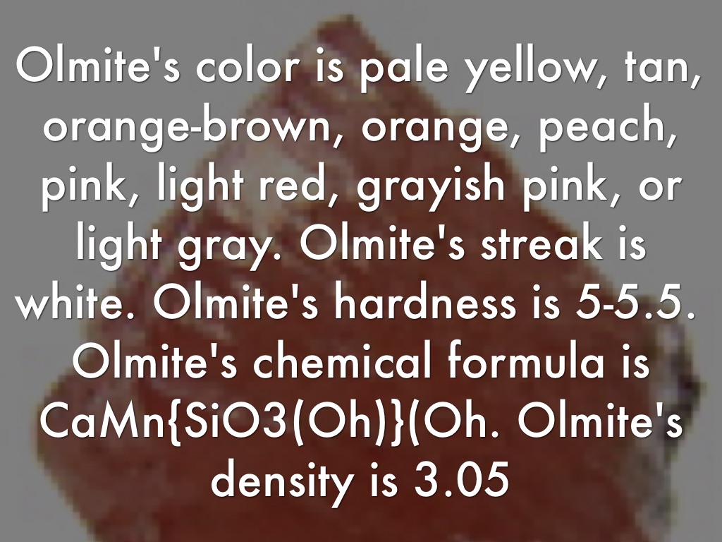 Olmite's color is pale yellow, tan, orange-brown, orange, peach, pink, light red, grayish pink, or light gray. Olmite's streak is white. Olmite's hardness is 5-5.5. Olmite's chemical formula is CaMn{SiO3(Oh)}(Oh. Olmite's density is 3.05