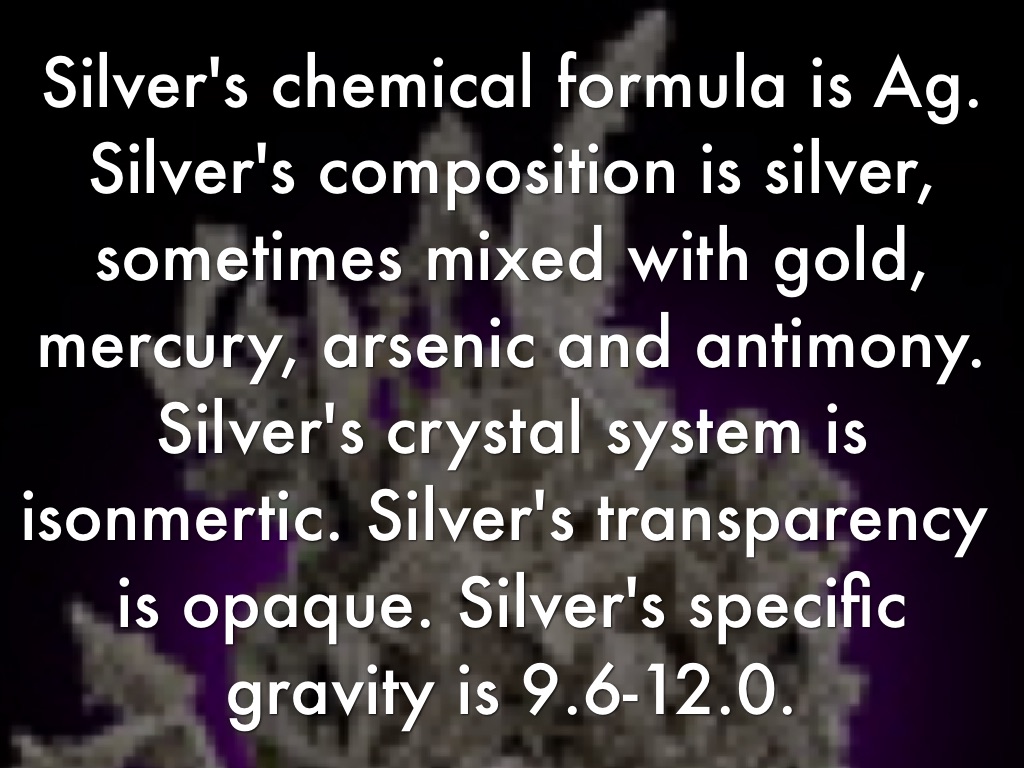 Silver's chemical formula is Ag. Silver's composition is silver, sometimes mixed with gold, mercury, arsenic and antimony. Silver's crystal system is isonmertic. Silver's transparency is opaque. Silver's specific gravity is 9.6-12.0.