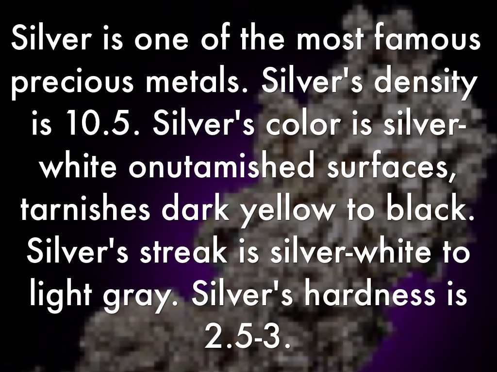 Silver is one of the most famous precious metals. Silver's density is 10.5. Silver's color is silver-white onutamished surfaces, tarnishes dark yellow to black. Silver's streak is silver-white to light gray. Silver's hardness is 2.5-3.